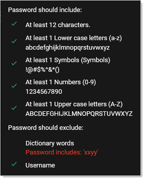 xxyy. The user enters a strong password that contains the string, and Secret Server rejects it anyway:The excluded words are not case sensitive.XXyYwould have triggered a password rejection too.When you hover the mouse pointer over the password strength bar, the disallowed string appears in red: