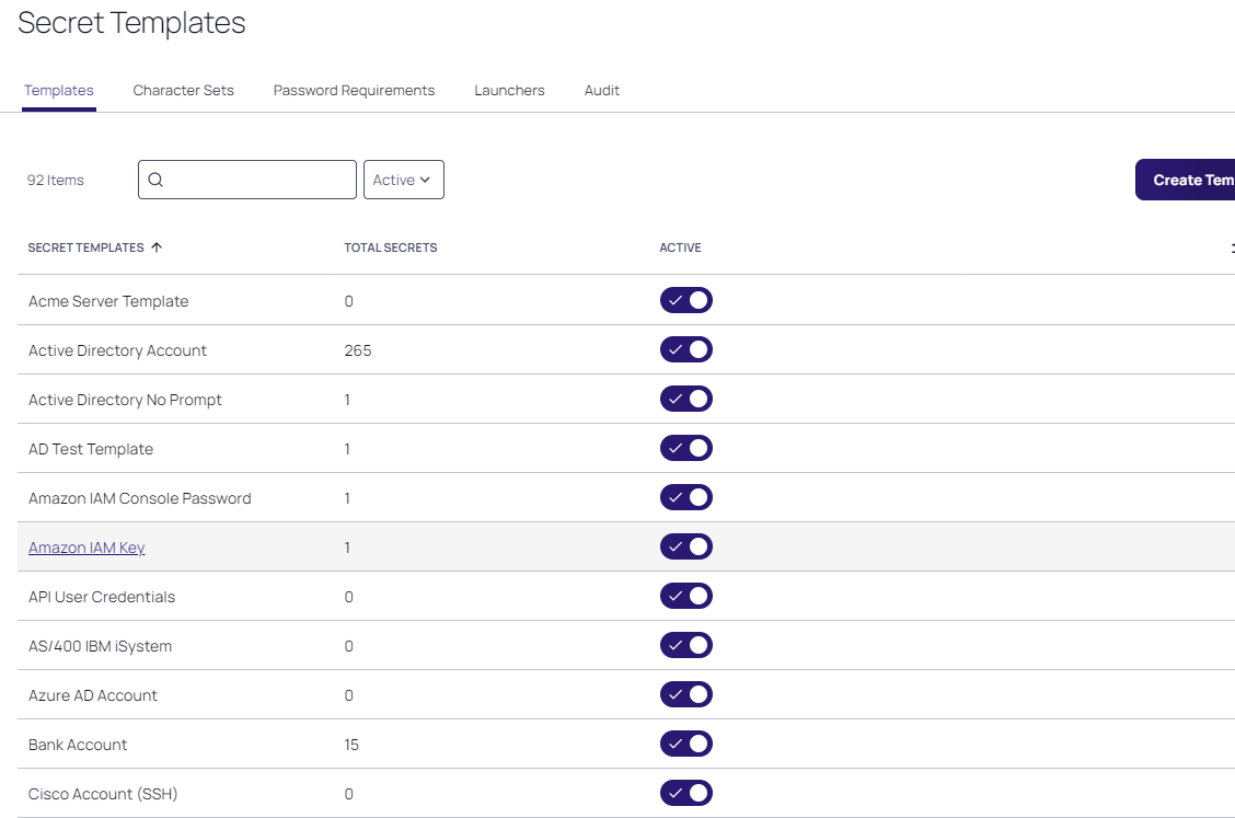Go to Admin > Secret Templates. The Manage Secret Templates page appears: