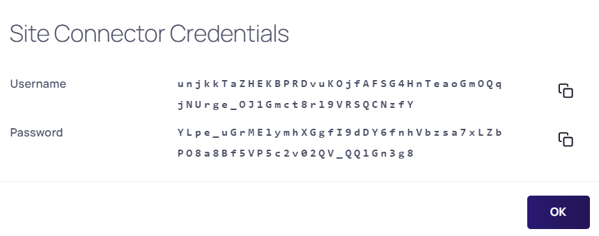 Select the View Credentials button to retrieve the automatically generated credentials. The Site Connector Credentials pop-up will appear: