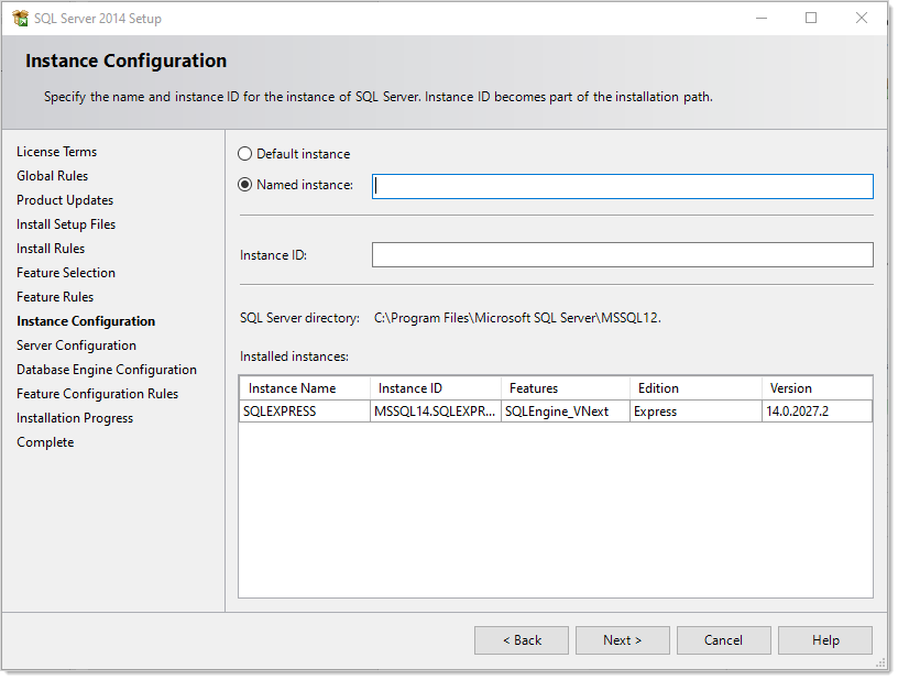 Ether click to select the Default instance selection button, which uses an already present instance called SQLEXPRESS.