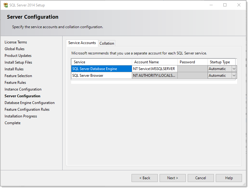 Leave the page as is, and click the Next > button. The Database Engine Configuration page appears: