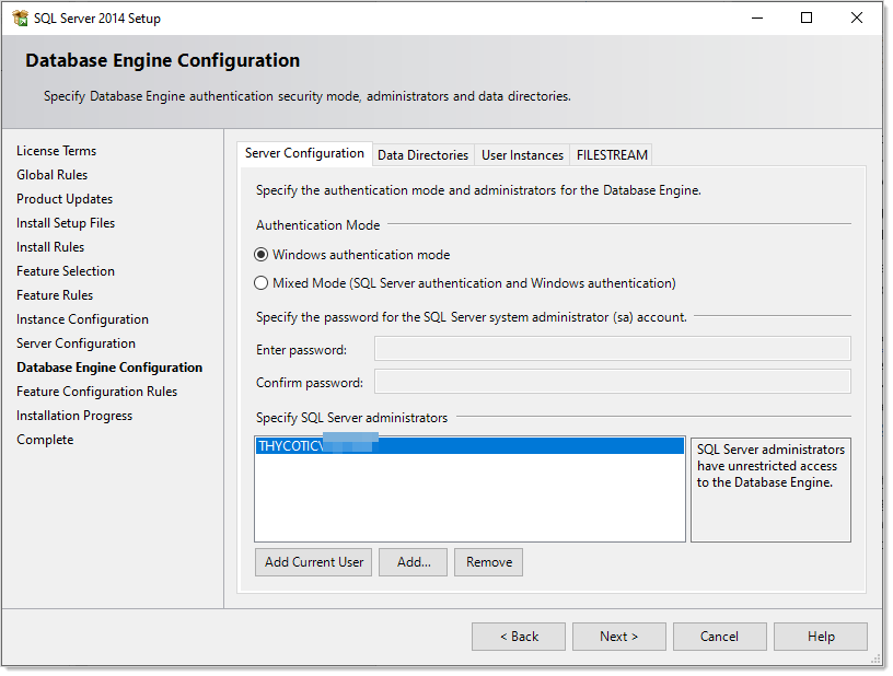 Your user account should already be shown in the Specify SQL Server administrators text box. If not, click the Add Current User button.