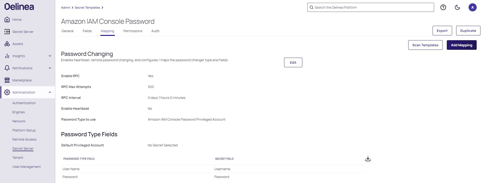 Remote Password Changing (RPC) provides pre-configured password changers assigned to specific secret templates available out of the box. You can view and modify secret templates in the Secret Server administration panel. All possible modification options for secret templates are described in Creating or Editing Secret Templates. Ensure that the secret template is active. For details, see Activating and Deactivating Templates.