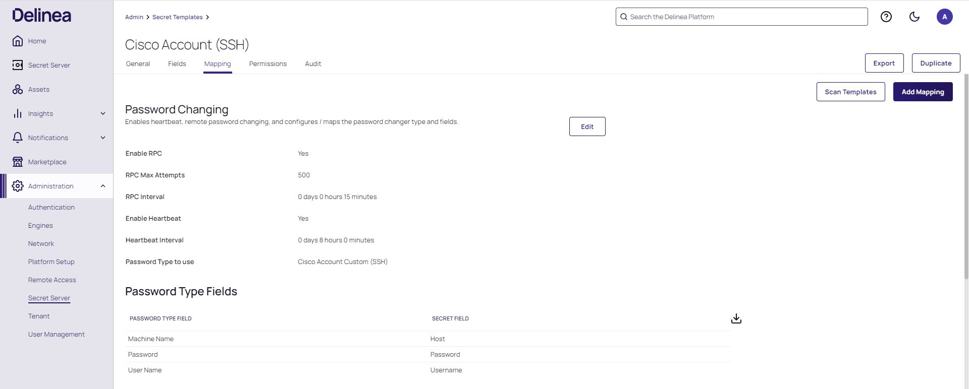 Secret Templates determine the fields, launchers, and the remote password changer for secrets. To utilize the Cisco Account template on a secret, see Managing Secrets documentation.