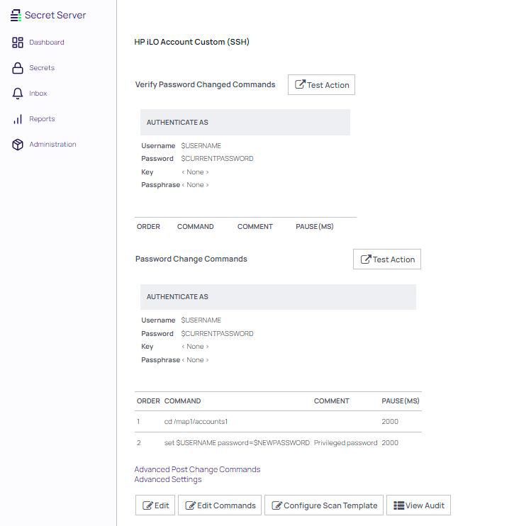This document briefly discusses using Secret Server Remote Password Changing (RPC) for HP Integrated Lights-Out (iLO) accounts. With Remote Password Changing (RPC), secrets can automatically change remote account passwords when a secret expires, either immediately or on a defined schedule. In addition, the new passwords’ strengths and other qualities are completely configurable. See the Password Changer List for a complete list of available password changers.