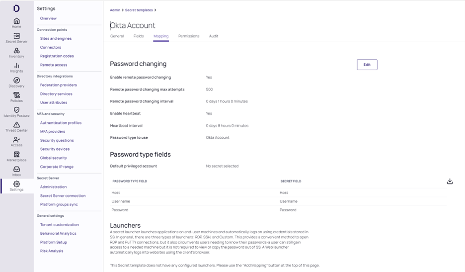 Secret templates determine the fields, launchers, and the remote password changer for secrets. To utilize the Okta Account template on a secret, see Managing Secrets