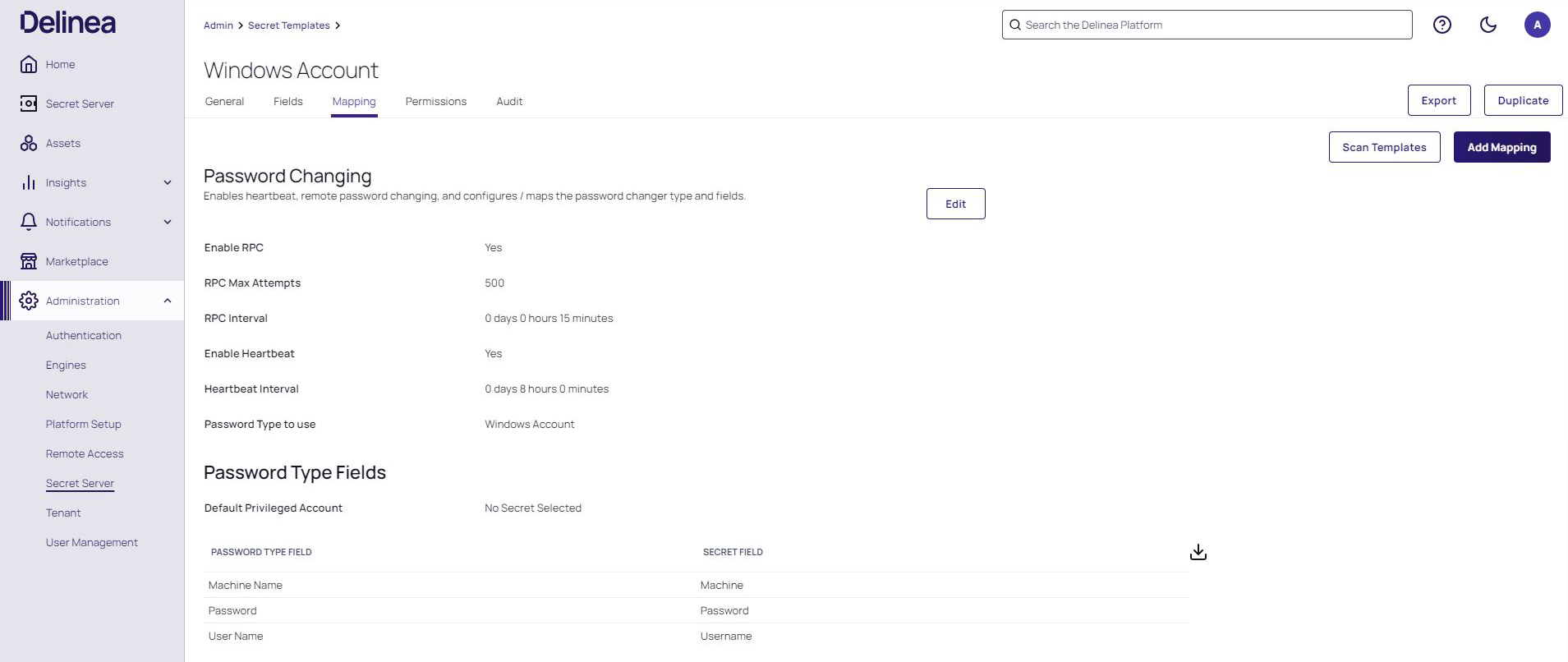 After completing the RPC setup, you can manage the built-in secret templates. Each secret template is specific application and is preconfigured with the password changer best suited to that. For the Windows Account, we want the Windows Account template.