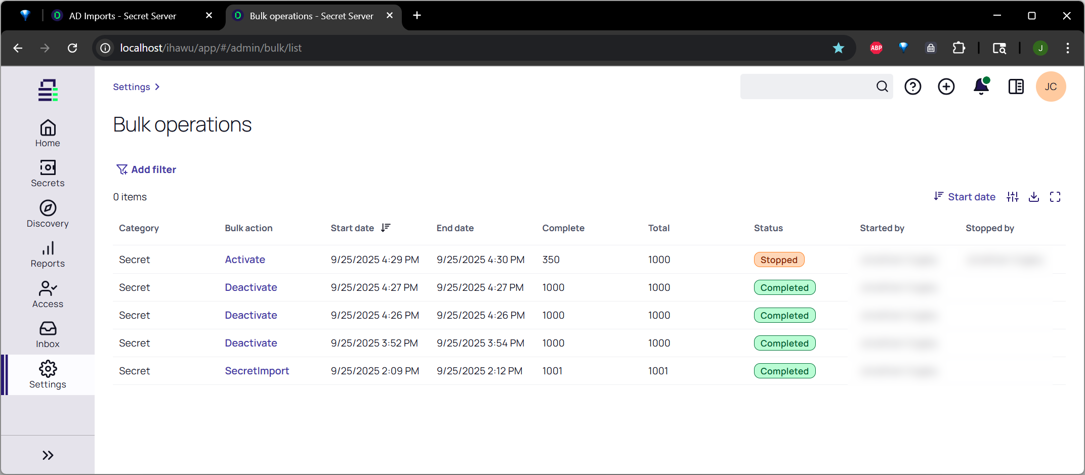 Go to Settings and click on Bulk Operations in the Secrets section. The Bulk Operations Dashboard appears: