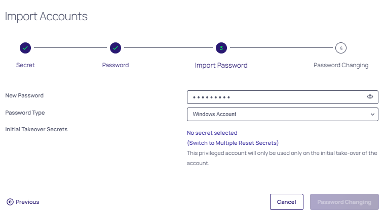 If you choose "Assign a new specific password to all accounts" you will be prompted to type in a new password, choose the password type, and choose the Initial Takeover Secrets from the available link: