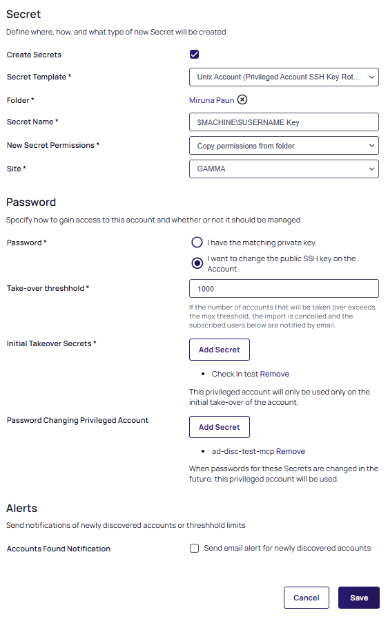 From the Secret Template dropdown list, choose one of the two options: Unix Account (SSH Key Rotation - No Password) or Unix Account (Privileged Account SSH Key Rotation - No Password).