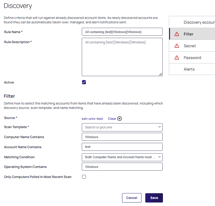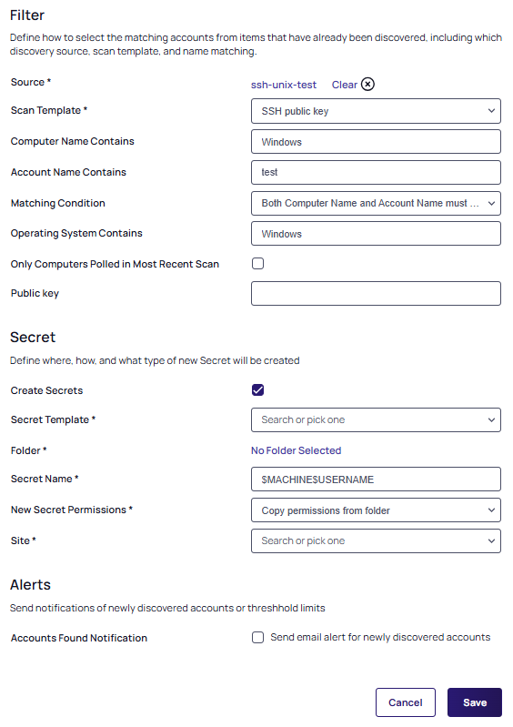 Discovery rules automatically create secrets and send emails when local accounts or public keys match the rule.