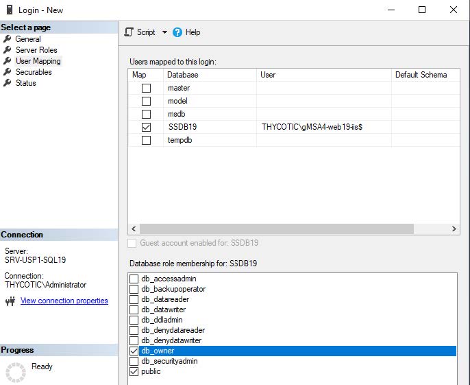 On the Secret Server Database Server, add the gMSA4-web19-iis account to be DBOwner of Secret Server database