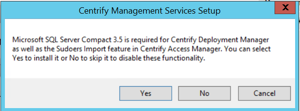 At the following screen, select Yes to install Microsoft SQL Server Compact. The Access Manager console uses the Microsoft SQL Server Compact for storage.