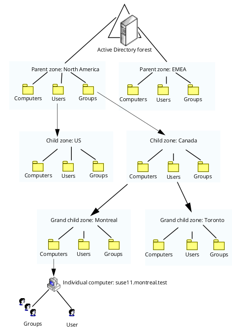 In hierarchical Delinea zones, each zone is part of a tree of zones and Active Directory containers for users, groups, and computers. The effective profile for each user, group, or computer in a hierarchical zone is determined by attributes defined in the current zone, in parent zones, and in zone default values, with values lower in the hierarchy taking priority. In addition, individual computers can have computer-level overrides of users, groups, and role assignments. When you assign computer-level overrides for a specific computer, internally Delinea creates a computer-specific zone that contains the users, groups, and computer role assignments that are specific to only that one computer. Computer zones are not exposed as zones in Access Manager, but are treated as end nodes in the zone hierarchy.