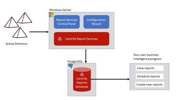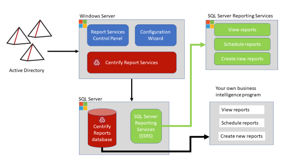 Report services provides reports on your Active Directory environment and the data is stored in a database that’s optimized for reporting. You can synchronize your Active Directory information to your reporting database, and then allow your users access to the reporting data.