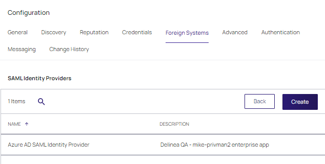 Select Admin | Configuration | Foreign Systems. In the Foreign System tab, select Azure AD SAML Identity Provider. Click Create.