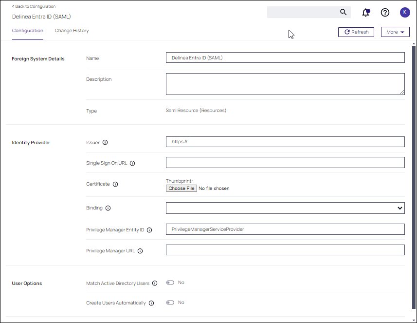Privilege Manager Configuration Entra ID Tenant Identity Provider Entity id User access URL -