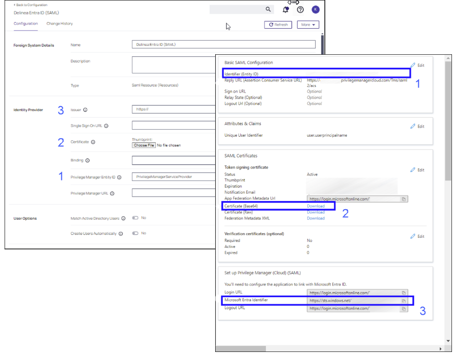 Privilege Manager Configuration Entra ID Tenant Issuer Microsoft Entra Identifier Certificate Certificate (Base 64) Privilege Manager Entity ID Identifier (Entity ID) -