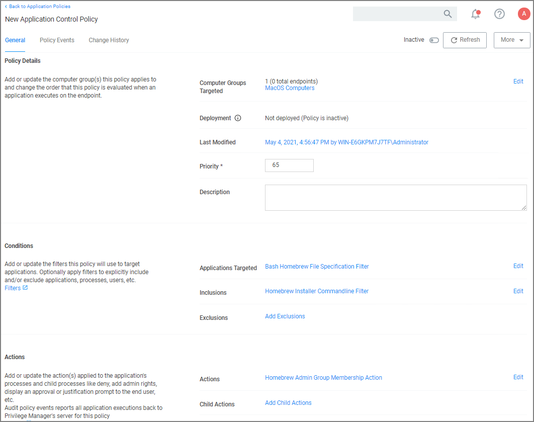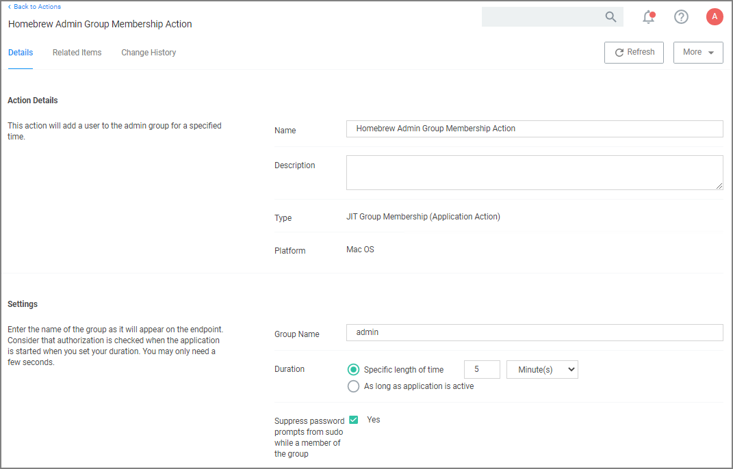 Name the Action and provide a description to reflect the purpose, for example Homebrew Admin Group Membership Action.
