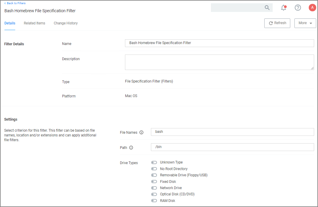 Name the filter and provide a description to reflect the purpose, for example Bash Homebrew File Specification Filter.