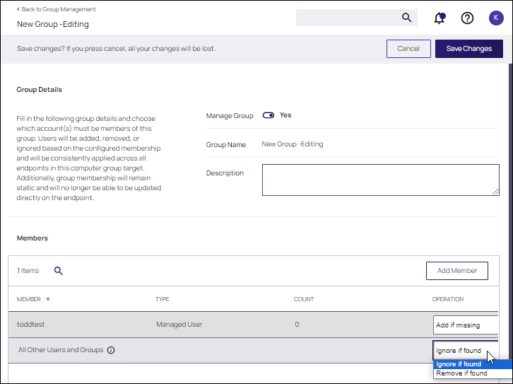 | Ignore if found | If this member is found in the group on the agent endpoint, they will remain there and will not be removed. | |