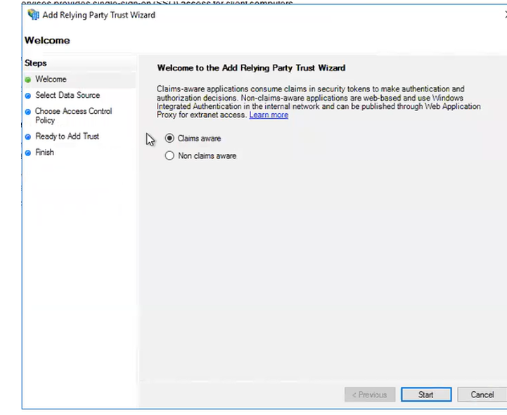Select the Claims aware radio button and click the Start button to continue.