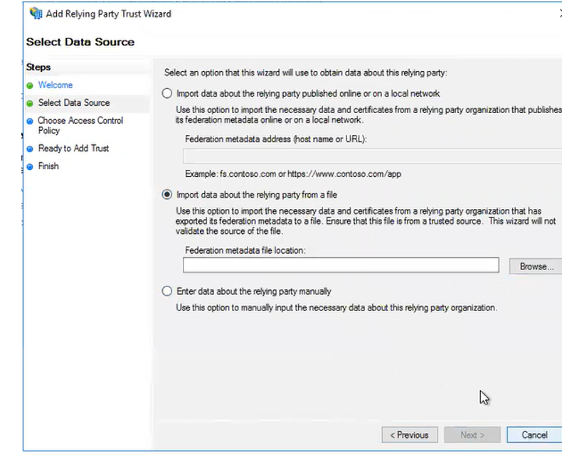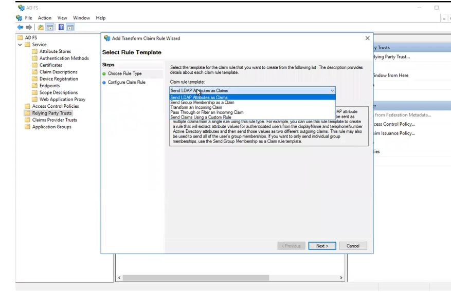 Click on the Add Relying Party Trust link in the right pane to start the Add Relying Party Trust wizard