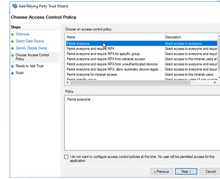 Choose the Permit everyone access control policy and then click Next to continue. You may optionally select another access control policy to permit only a smaller subset of users and/or require multi-factor authenticator (MFA), if needed; however, these other access control policies will not be covered in this configuration.