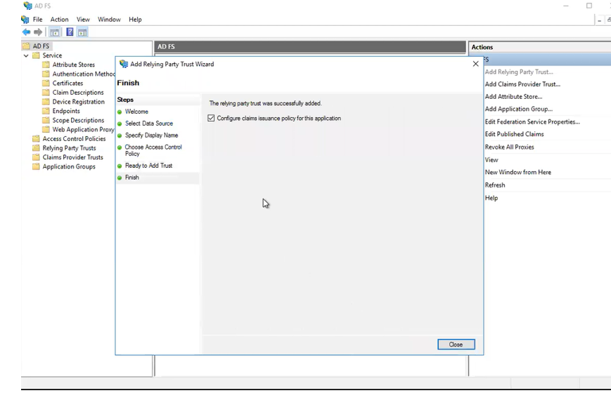 On the Finish page, make sure the Configure claims issuance policy for this application