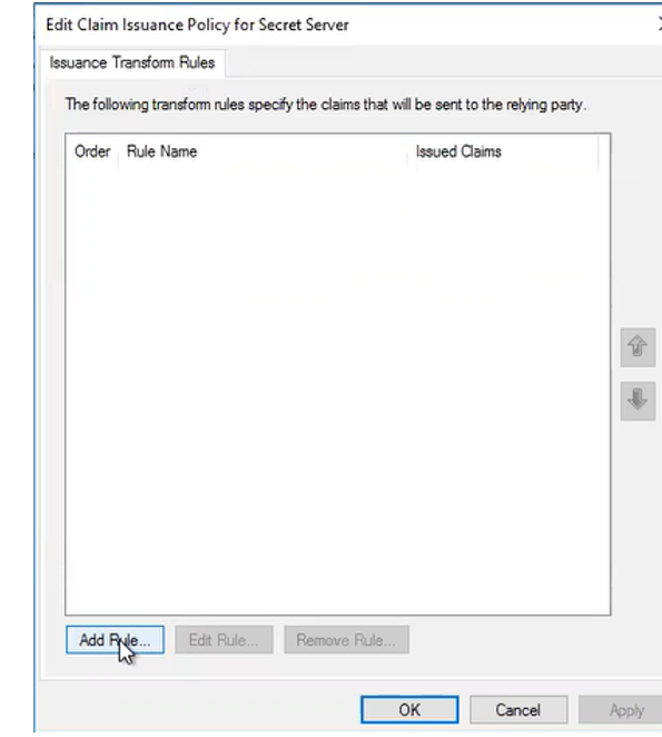 We have now created the Relying Party trust in ADFS for Secret Server; however, we must set a claim rule so that ADFS relays information to Secret Server to describe the user’s identify and authenticate.