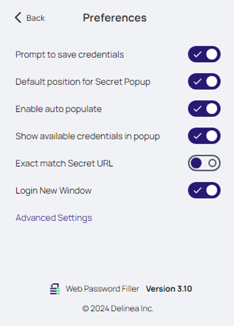 | SettingShowPopUp | true | Boolean that enables login credentials to pop up automatically. If false you just need to click the Delinea checkmark. |